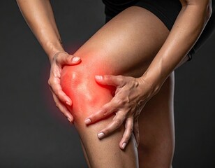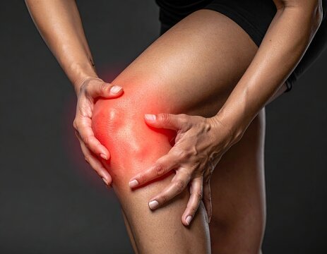 Person holds knee in pain, red glow indicating inflammation, dark background