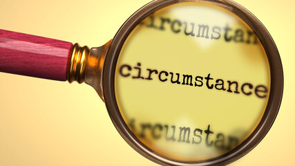 Examine and study circumstance, showed as a magnify glass and word circumstance to symbolize process of analyzing, exploring, learning and taking a closer look at circumstance, 3d illustration