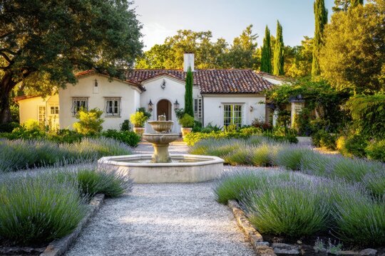 Relaxing garden setting with a fountain in front of a house surrounded by lavender plants and tall trees during the late afternoon light