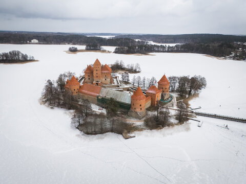 Aerial view of the brick castle standing proudly amidst the snow-covered island surrounded by the frozen lake, a testament to history and resilience, Trakai, Trakai, Lithuania.