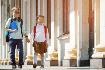 Two little pupil of elementary school, boy and girl, stand having joined hands
