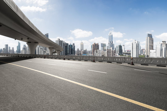 asphalt road with city skyline