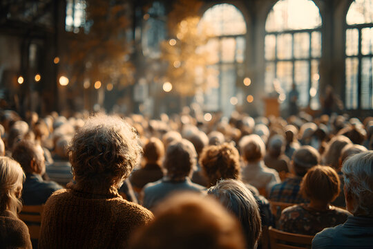 town hall meeting with citizens engaging in discussions democratic process of dialogue. community involvement, open and inviting space, people sitting with their backs towards camera, no faces seen