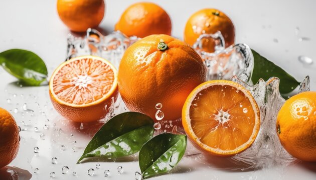 Fresh ripe oranges with water splash splashes drops background. Close up of juicy fruit backdrop