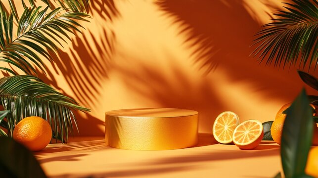 Vibrant citrus display with tropical leaves and bright orange backdrop, showcasing oranges and lemons on a sleek pedestal.