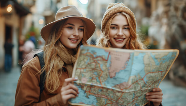 Fun, friends, travel and tourism concept. Beautiful girls looking for direction in the city