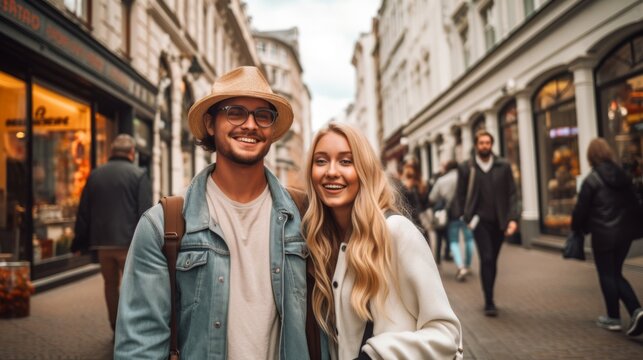 Couple enjoying a city break, smiling and sightseeing, travel and relationship concept.