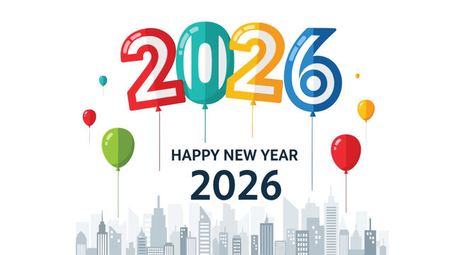 Happy new year 2026 celebration with colorful balloons floating above a city skyline illustration