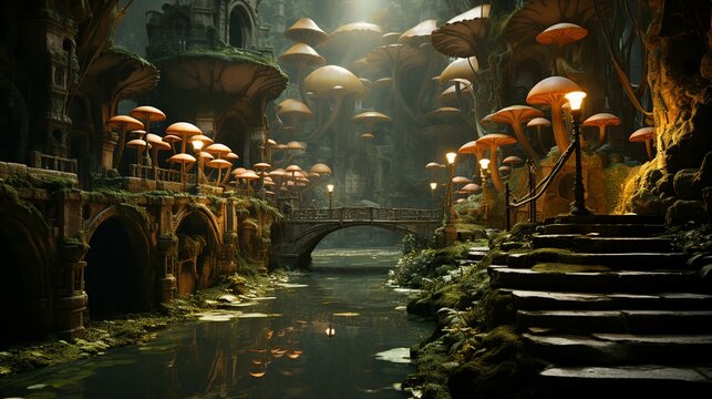 A lone figure stands amidst the ruins of a futuristic city at sunset.