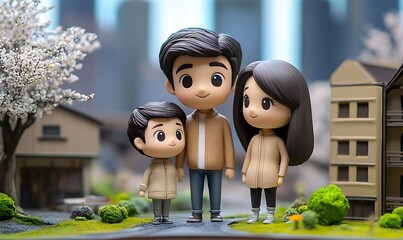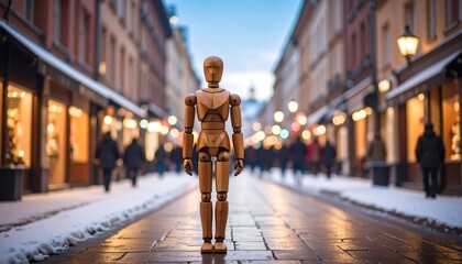 Wooden figurine standing in a nostalgic place of the past amidst a futuristic city