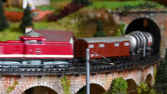 Model freight train exits the tunnel and passes over a bridge. Model railway.