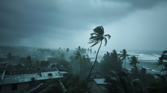 Stormy weather over a coastal city landscape.