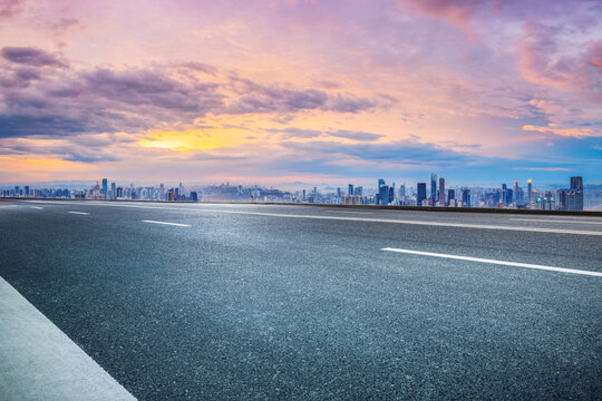 Empty asphalt road and city buildings skyline at night