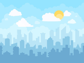 Cartoon blue sky cityscape. Cloudy sky, city skyline landscape, midday graphic urban silhouette cityscape illustration and town building layers bright vector background. Urban panoramic view