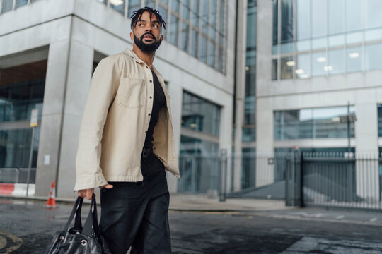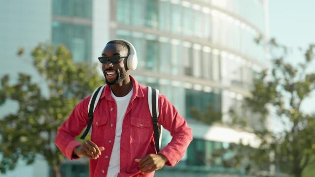 Happy cool stylish young African Black man student hipster wearing headphones, sunglasses and backpack feeling joy having fun listening music and dancing on city street outdoors on sunny day.