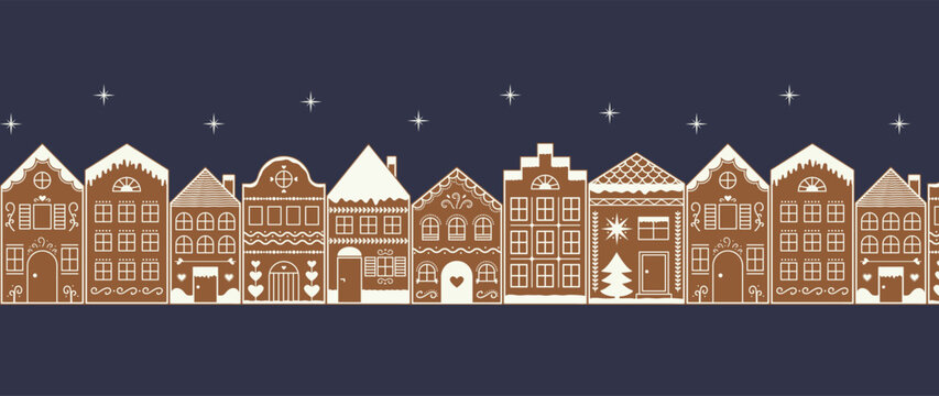 Night Cityscape Gingerbread Village seamless border. City houses street with stars pattern. Winter holiday Landscape. Vector illustration
