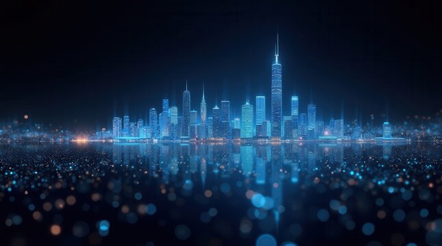 Peaceful futuristic cityscape glowing at night across water
