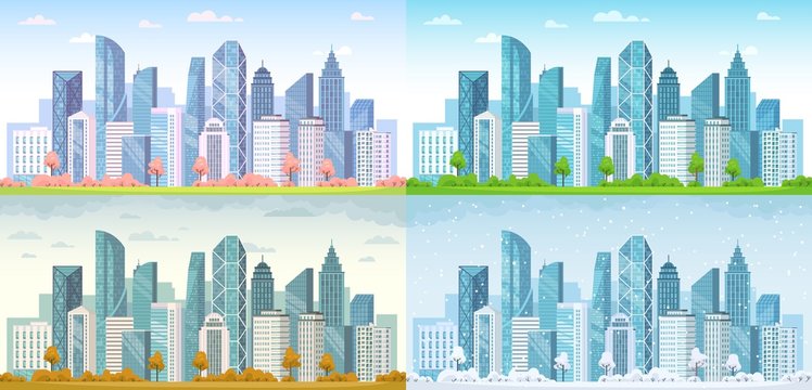 Urban city seasons. Spring town, summer, autumn urban panorama and cold winter cityscape vector background illustration set. City urban spring season, outdoor landscape summer