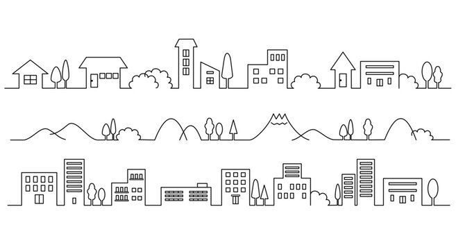 シンプルな黒い線の街並みと山並みとビル街のセット