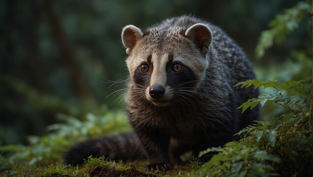 A beautiful close-up of a civet cat peeking through the lush green foliage, focused gaze directed towards the camera