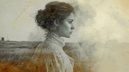 Historical Portrait Of A European Woman In Vintage dress. Overlay Texture Painting. Women History Month. Concepts Of Memory and Heritage. AI Generated