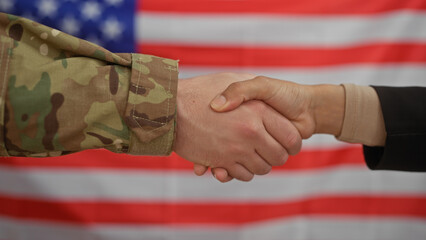 A civilian woman and a military man shake hands in front of an american flag, symbolizing collaboration.