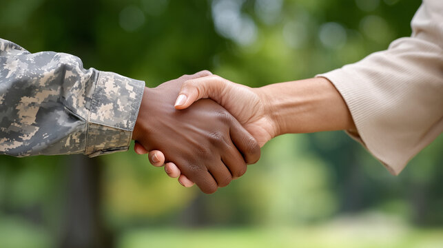 A soldier and a businessman shake hands, symbolizing a strong partnership forged between military service and civilian life.