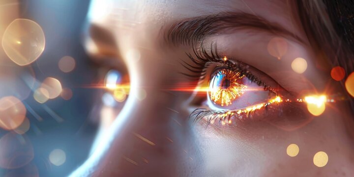 Young woman s eye in mesmerizing lights, expressing clairvoyant vision and spiritual emotion