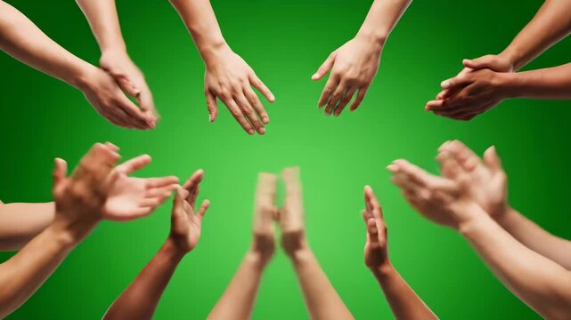 Multiple hands in a circle, some clapping and others reaching, against a bright green backdrop, conveying a sense of shared enthusiasm and connection vector illustration