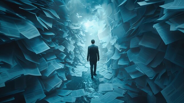 Businessperson walking into a labyrinth of tax forms, depicting tax complexity, more clarity with clear light and sharp focus , high detailed ,