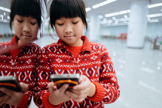 Young Girl in Red Sweater Using Smartphone in Bright Indoor Space