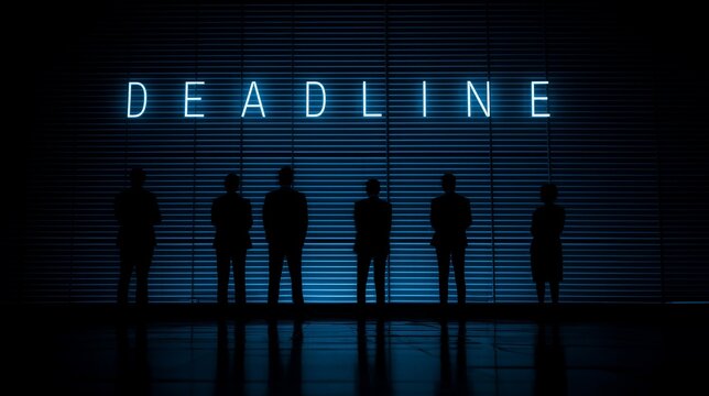 Silhouetted figures standing in front of "DEADLINE" text against a blue backdrop in a modern office space