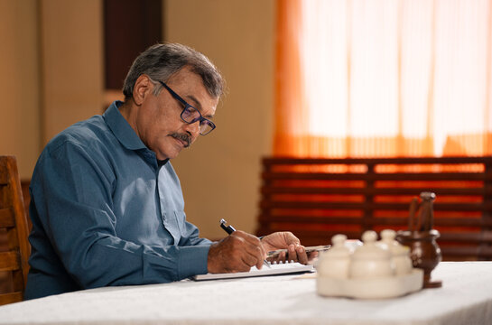Indian senior man calculating monthly expenses or budget at at home - concept of financial planning, discipline and household expenses
