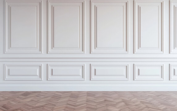 Elegant white paneled wall with herringbone wooden floor. Ideal for interior design, home decor, and architectural backgrounds.
