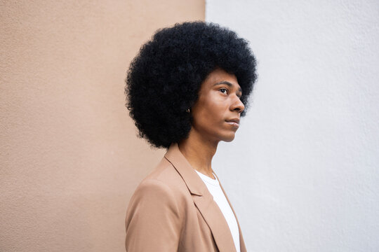 Person wearing a brown blazer with an afro hairstyle