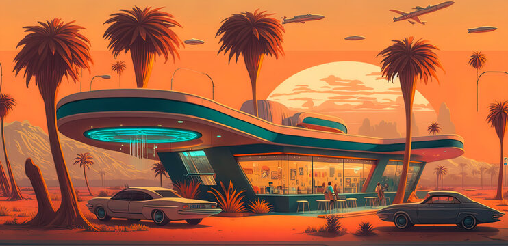 A sci-fi take on the classic American diner: Sunset cafe on a retro-futuristic island in the style of a 50's illustration!