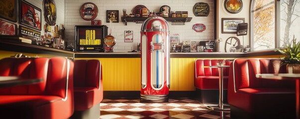 A traditional diner setting reminiscent of the 1950s, complete with vibrant decorations and a nostalgic atmosphere