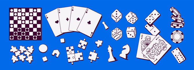 Vector illustration with various board games and playing elements. Includes chess, poker chips, domino, dice, cards, puzzles, and meeples. Perfect for game design, hobby, entertainment events.