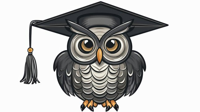 A graduation cap on owl clipart, wisdom element, classic design, black and white, isolated on white background