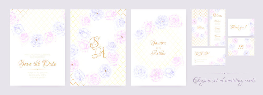 Luxurious wedding card set Brown gold beige tones Decorated with colorful flowers to stand out on your wedding day. illustration/Vector