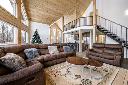 Winter cottages in remote area Quebec, Canada, log house with sauna, SPA, bedrooms, pool, living room, messanine, kitchen and bathrooms