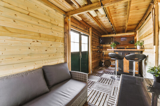Wooden cabin with sofa and coffee table