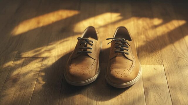 A pair of adult shoes and children's shoes side-by-side on wooden floor.