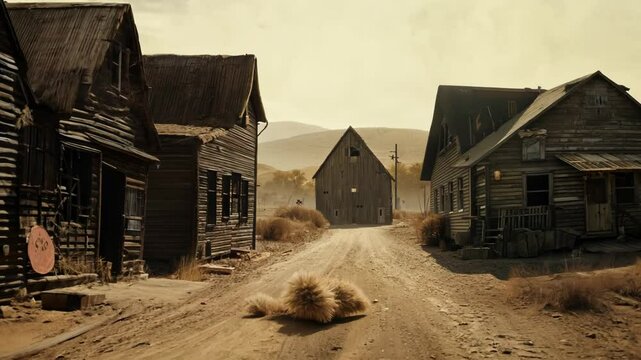 Sunny view of a deserted street lined with classic western-style facades and wooden carts
