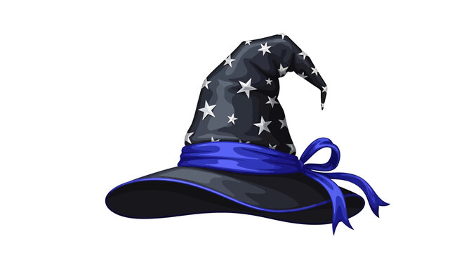 Magical witch hat with silver star patterns and blue ribbon in elegant vector style
