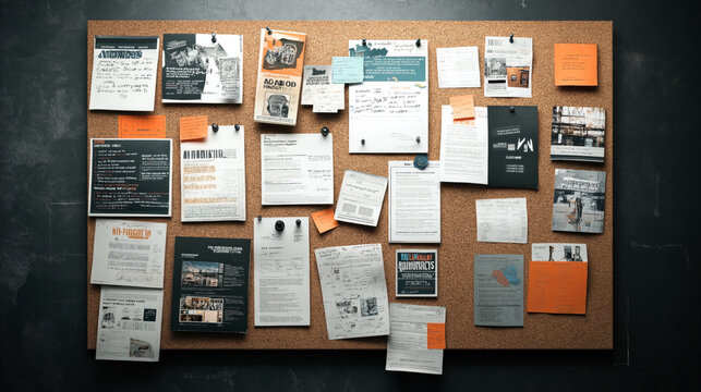 Cork bulletin board with various papers, flyers, and notes pinned, including event announcements, informational sheets, and handwritten reminders in a classroom or office setting.