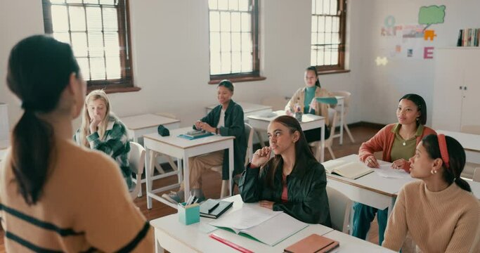 A teacher guides diverse children in a classroom. Kids and teacher engage in learning. Classroom interaction with children and teacher. Educational setting. Teacher teaching young students.