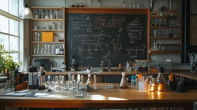 A clean physics classroom with neatly labeled diagrams and lab equipment
