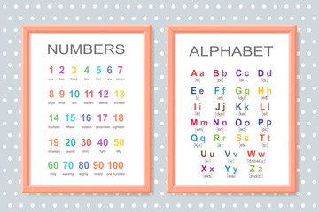 Set of educational posters of alphabet and numbers in frame. Vector illustration