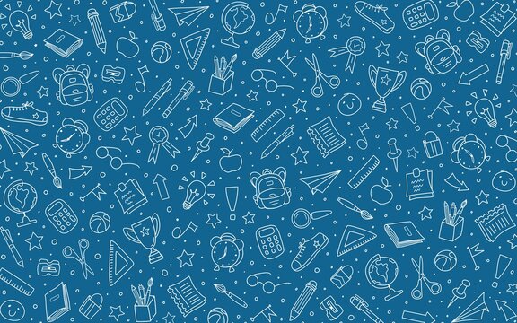 School supplies doodles on a blue background. Hand-drawn design. Science motifs. Back to school concept. White elements. Wallpaper, backdrop, pattern.